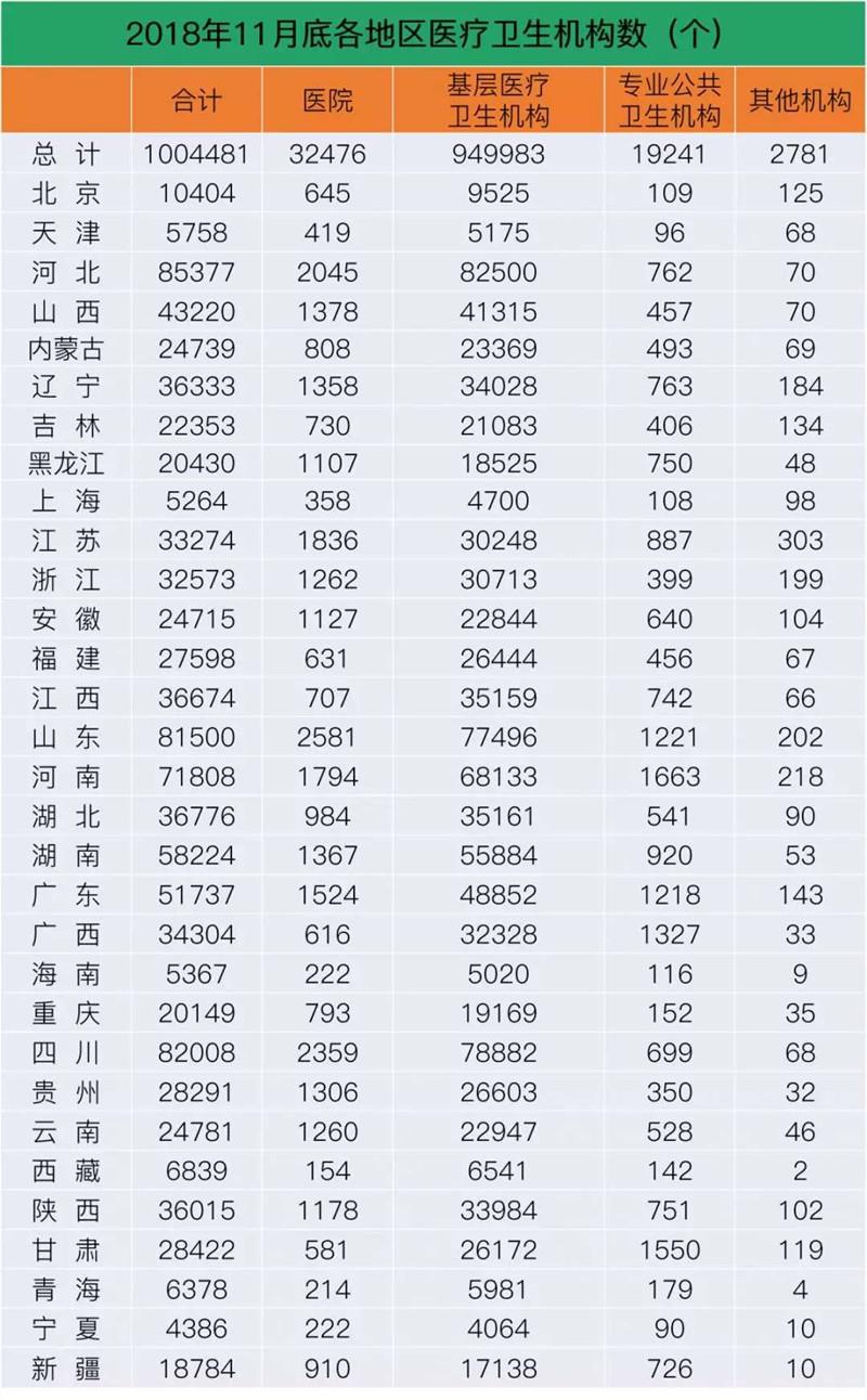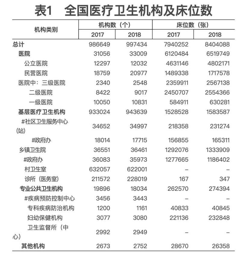 5月22日,國(guó)家衛(wèi)生健康委發(fā)布《2018年我國(guó)衛(wèi)生健康事業(yè)發(fā)展統(tǒng)計(jì)公報(bào)》(下稱《公報(bào)》)。數(shù)據(jù)顯示,2018年末,全國(guó)醫(yī)療衛(wèi)生機(jī)構(gòu)總數(shù)達(dá)997434個(gè),其中醫(yī)院33009個(gè)。