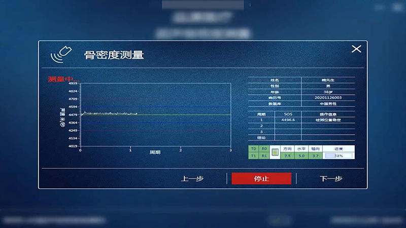 啟動(dòng)測(cè)量:完成上述設(shè)置及“校驗(yàn)”后,點(diǎn)擊軟件界面上的“開始測(cè)量”按鈕。此時(shí),超聲骨密度儀開始發(fā)射超聲波,對(duì)受檢部位的骨骼進(jìn)行檢測(cè)。在測(cè)量過程中,要求受檢者保持靜止,同時(shí),操作人員需密切關(guān)注儀器屏幕上的數(shù)據(jù)采集進(jìn)度條,等待測(cè)量過程自動(dòng)完成。通常,一次完整的測(cè)量過程可能需要數(shù)秒,具體時(shí)間取決于儀器型號(hào)和受檢者的個(gè)體差異。