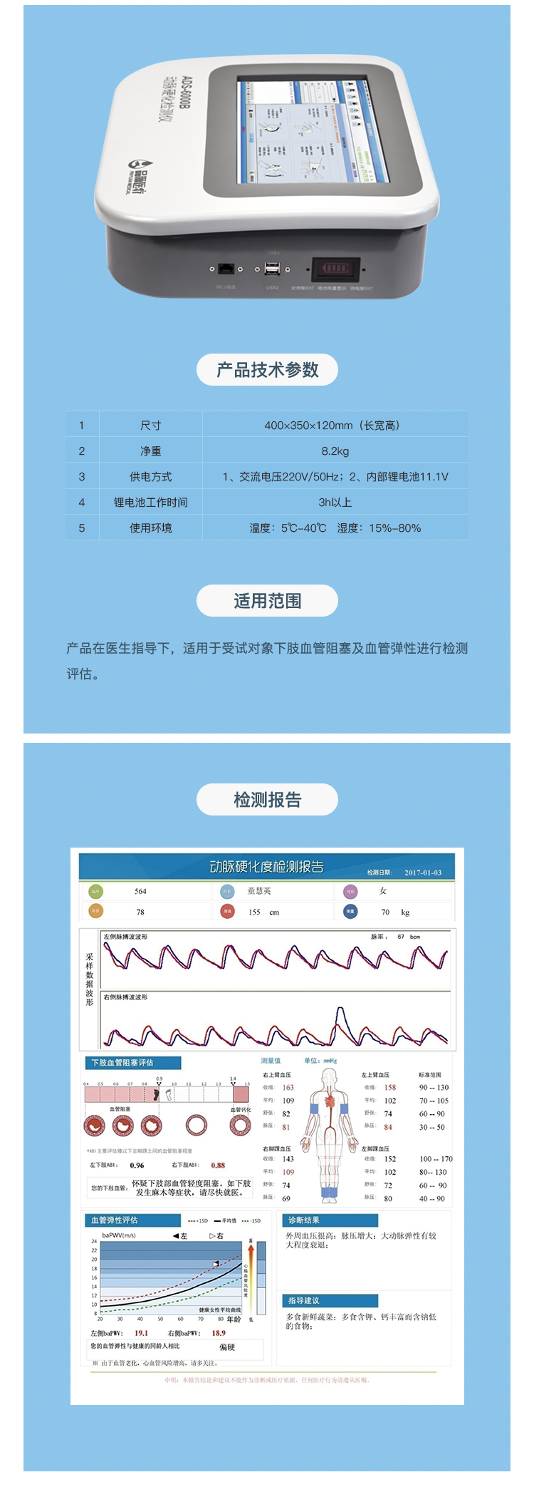 適用范圍:產(chǎn)品在醫(yī)生指導下,適用于受試對象下肢血管阻塞及血管彈性進行檢測評估。